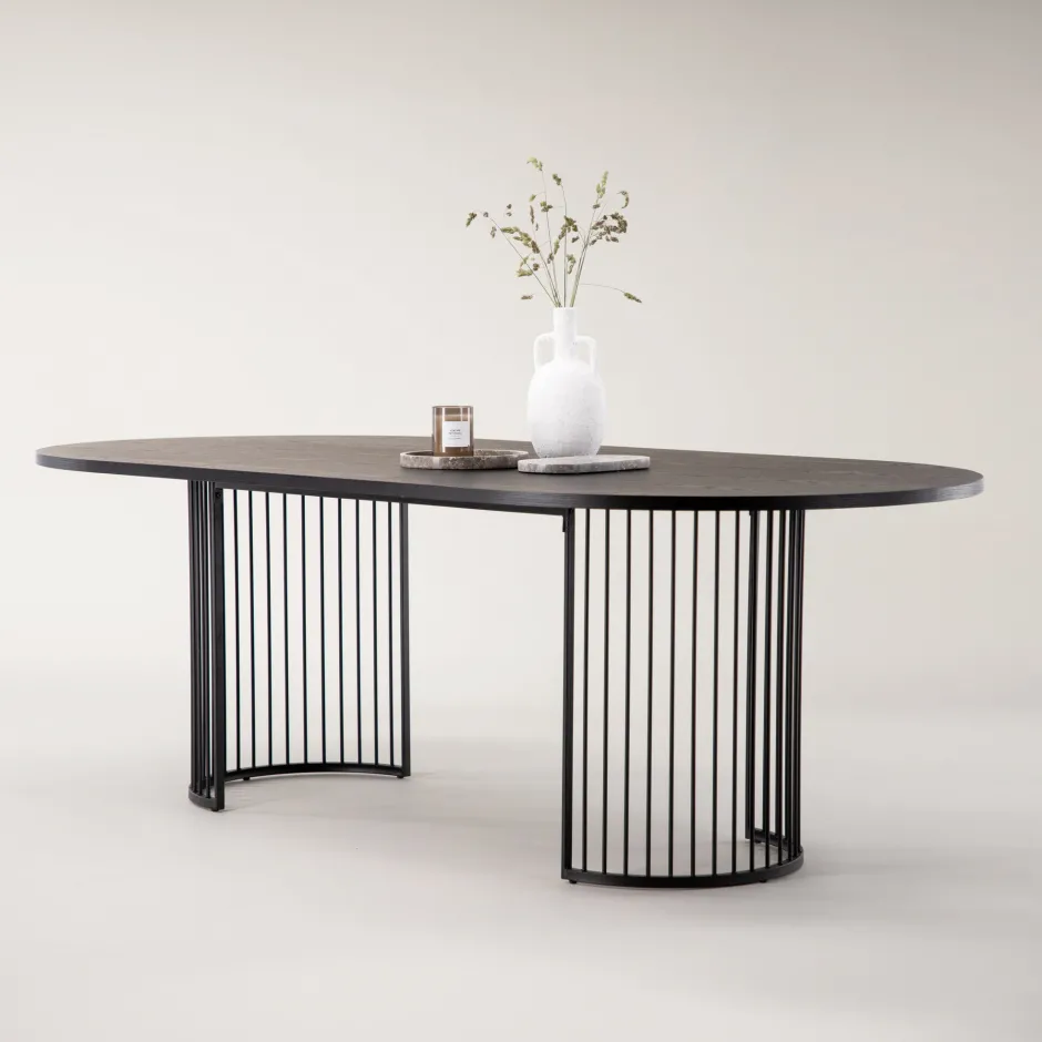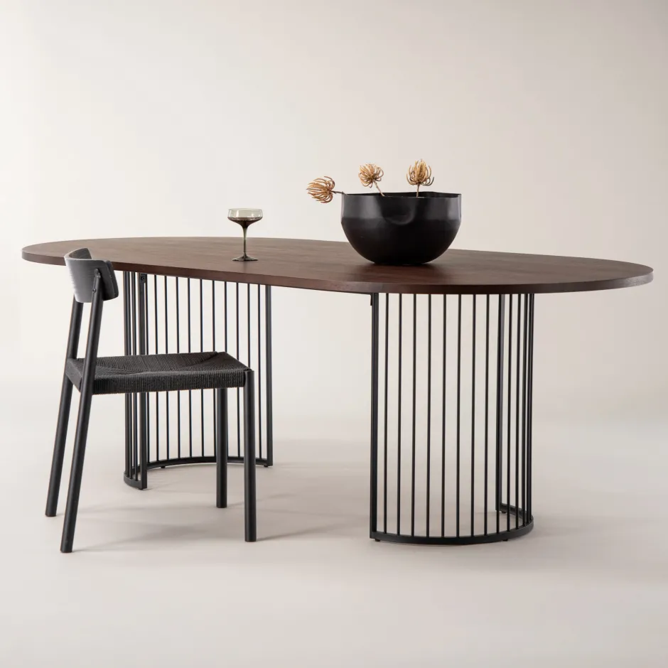 Creëer een uitnodigende en stijlvolle blikvanger in het hart van je huis met een opvallende eettafel uit de Emmauel serie! Deze elegante eettafel uit de wind collectie heeft een ovaal tafelblad van donker hout en een decoratief onderstel van smalle, zwart stalen structuur die de vorm heeft van twee halve cirkels. Hier hoef je geen compromis te sluiten tussen een praktische en elegante eettafel. Combineer met een paar stijlvolle eetkamerstoelen en je hebt de perfecte eetgroep voor alle maaltijden van de week!