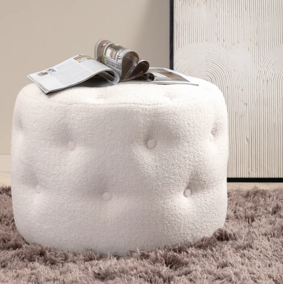 Richt je huis slim en stijlvol in! Melony in pluizige teddystof is een cilindervormige, multifunctionele poef in een grijsgroene kleur met decoratieve diepzittende en gestoffeerde knopen die zorgen voor een elegant totaalontwerp. De zachte vormen en dikke vulling maken de poef comfortabel om op te zitten, en hij werkt uitstekend als extra zitplaats als er veel gasten zijn. Gebruik hem ook als voetensteun, tijdelijk opbergoppervlak of zet hem solo neer als stijlicoon – jij beslist! Gemaakt van schuim, katoenvezel, teddystof en gebogen hout. Afmetingen van de poef: Hoogte: 44 cm, diameter: 55 cm.