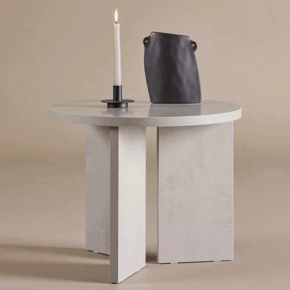Zeeshan is een ronde salontafel met een diameter van 55 cm, gemaakt van MDF en afgewerkt in een elegante zilveren tint. Het strakke tafelblad rust op drie brede, asymmetrisch geplaatste poten die de tafel een moderne en grafische uitstraling geven.