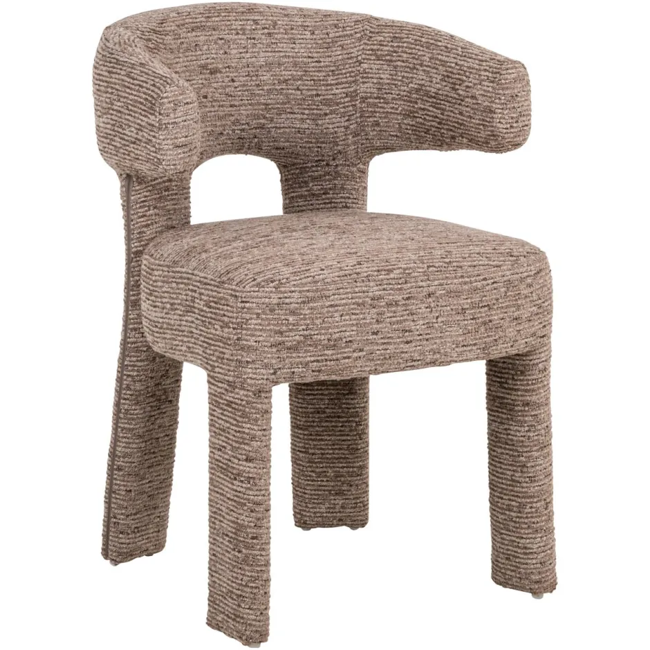 Eetkamerstoel Nerio heeft een sculpturaal frame met ronde vormen en een zachte zitting in mocca linear. Een gedurfd ontwerp met een artistieke uitstraling. Ook verkrijgbaar in natural fancy.