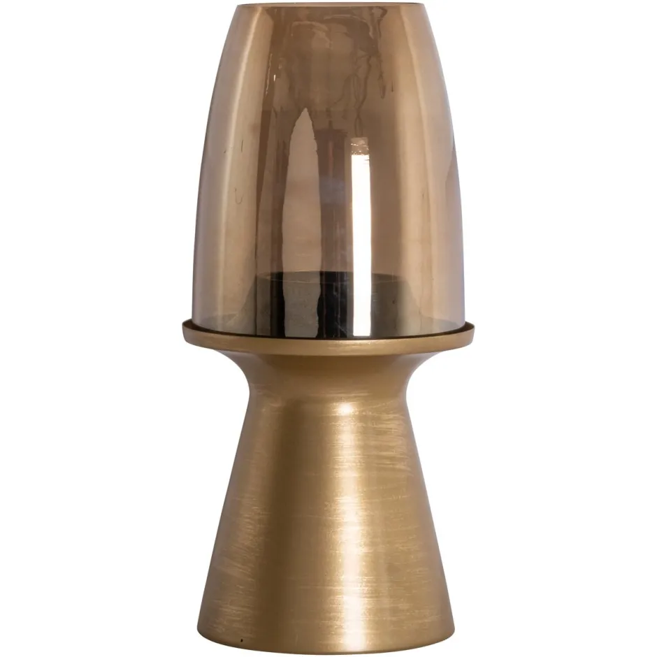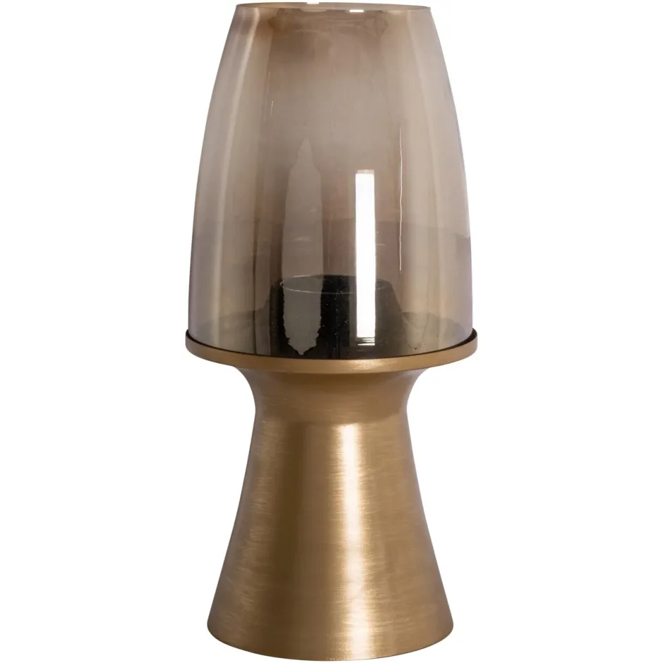 Windlicht Danea small heeft dezelfde elegante uitstraling in een compact formaat. Met zijn gouden basis en glazen kap is hij perfect op een console of salontafel.