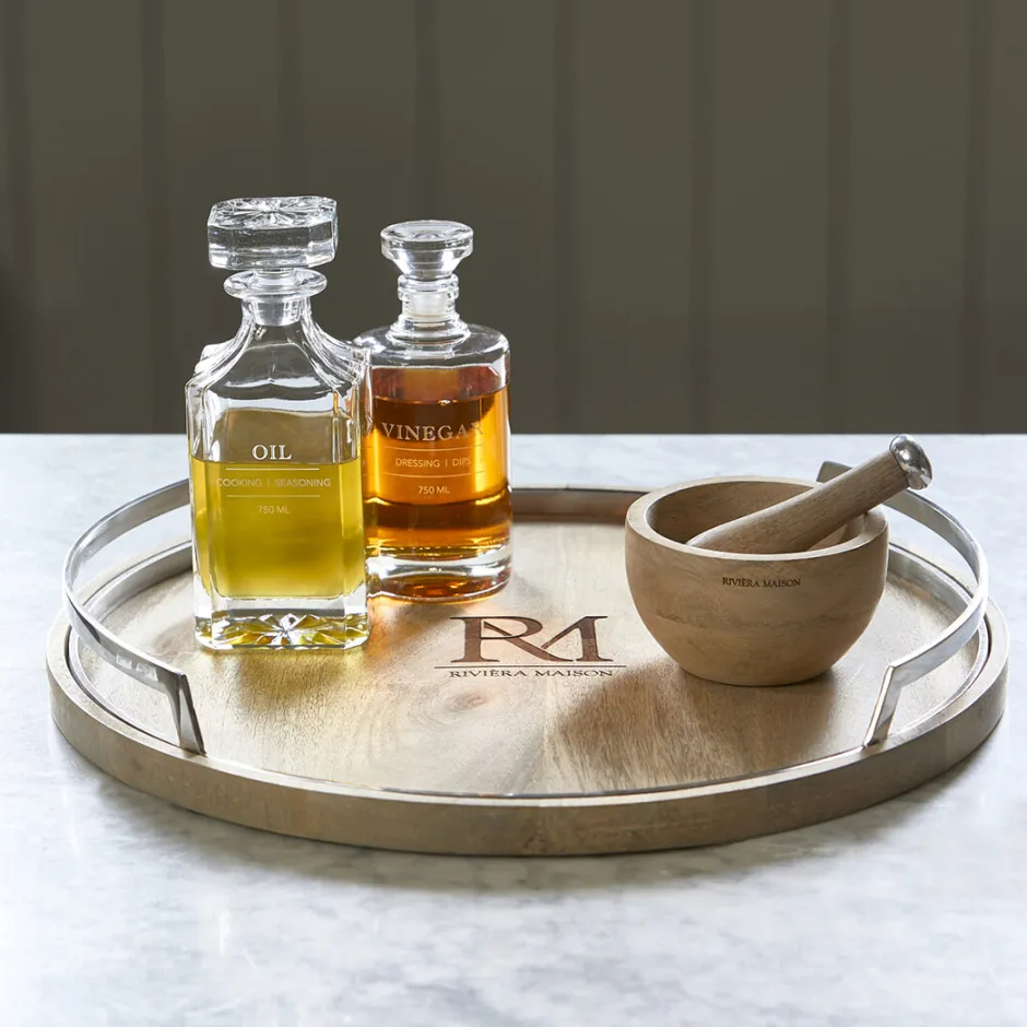 Dit prachtige royale dienblad RM Coventry is een ware eyecatcher voor jouw keuken of eetkamer. Het grote ronde design is gemaakt van mangohout en heeft elegante hendels van glanzend zilverkleurig aluminium. Het RM Monogram is in het hout gegraveerd! Geniet van een speelse en hippe sfeer met deze unieke serving tray.