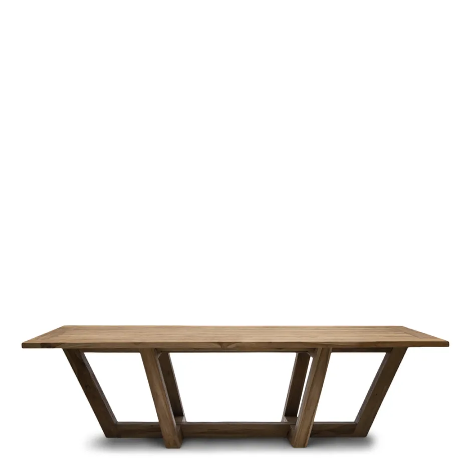 Eindeloos tafelen met zijn allen tijdens mooie zomeravonden, daar is ruimte genoeg voor aan deze tafel. Het blad is van stevig teakhout, de poten ook. Die rusten op één lange balk onder met daarop aansluitend de zijpoten. Daardoor is de tafel erg stevig. Deze eettafel is er in twee maten.