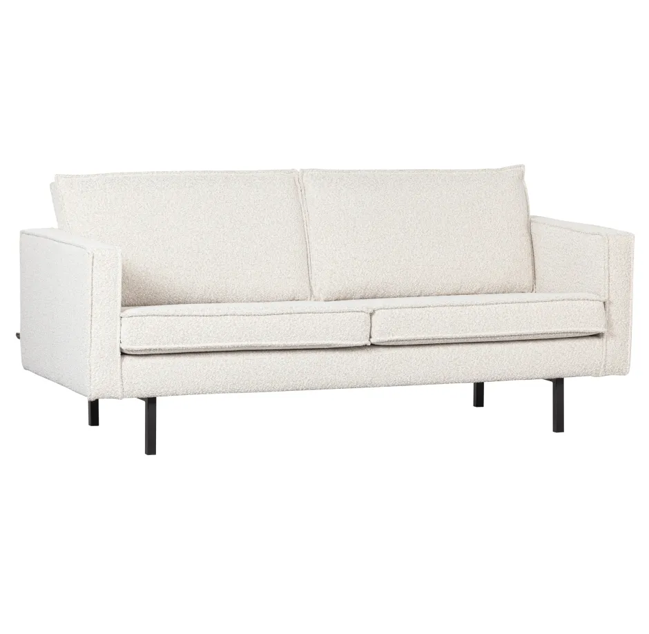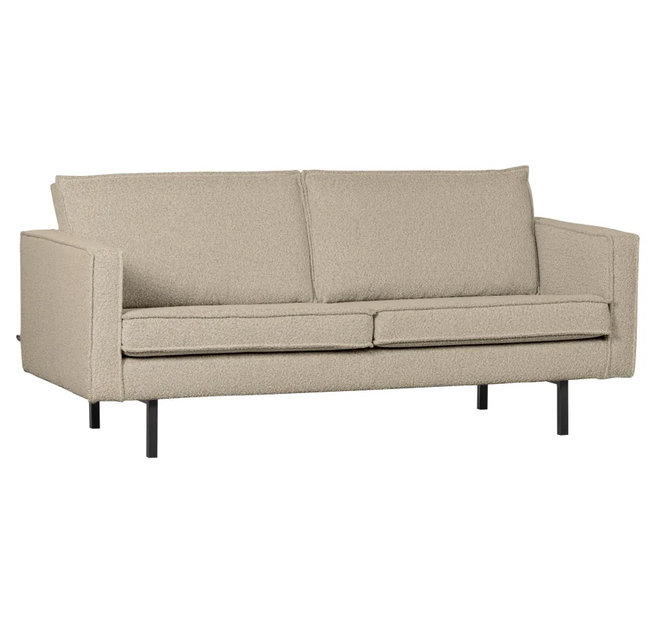 De Rodeo bank is opgebouwd uit een combinatie van massief hout, spaanplaat, polyurethaan schuim met een dichtheid van 25 kg/m3 en een zigzag vering. De zitting bevat een polyurethaan schuim met een dichtheid van 30 kg/m3 (T3037). De rugleuning bestaat uit een combinatie van 70% gesneden schuim en 30% siliconen. Deze Rodeo is bekleed met zachte bouclé. Het materiaal van de Colmar bouclé stof speelt in op de laatste trend: zachte materialen. De stof is zacht en heeft een elegante textuur die meteen warmte in huis brengt. Onze Colmar bouclé stof heeft een Martindale van 100.000, dat betekent dat de stof geschikt is voor intensief gebruik. De dichte weeftechniek zorgt voor de sterkte van de stof, dit maakt dat de bouclé niet snel zal slijten of scheuren. Ook heeft elke kleur een hoge kleurvastheid, maar het is aangeraden om direct zonlicht te vermijden om kleurnuances te voorkomen.