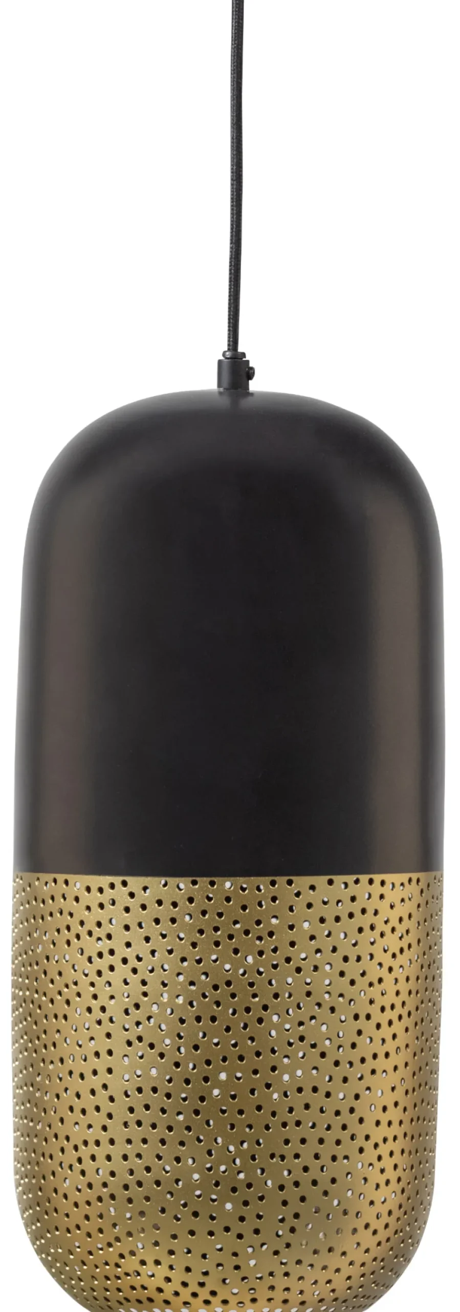 Klasse en warmte, dat brengt deze Tirsa hanglamp in jouw interieur. Deze chique hanglamp komt uit de collectie van het Nederlandse merk WOOOD. De bovenzijde van de Tirsa hanglamp bestaat uit matzwart metaal met een afgerond ontwerp. De onderste helft is gemaakt van metaal met een antique brass afwerking en een subtiele stans, hierdoor wordt het licht zacht gefilterd.