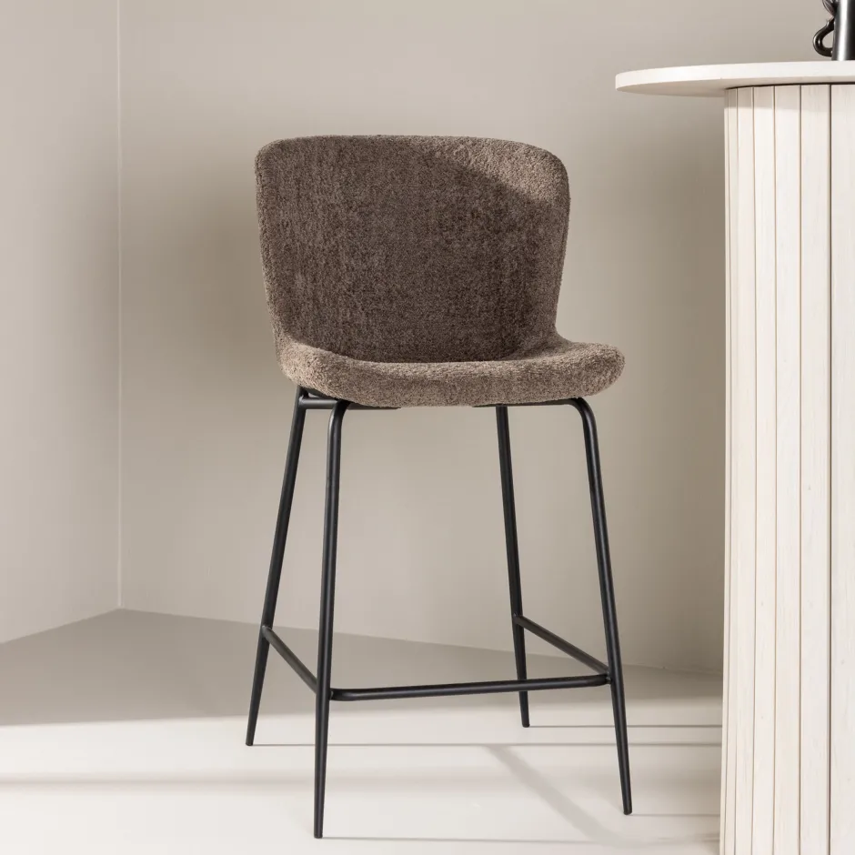 De bruine bouclé zitting geeft Artesha een warm en uitnodigend gevoel en voegt een vleugje luxe toe aan je keukenruimte. Met een rugleuning die extra comfort biedt, kun je genieten van lange gesprekken of ontspannende momenten terwijl je aan het kookeiland zit.