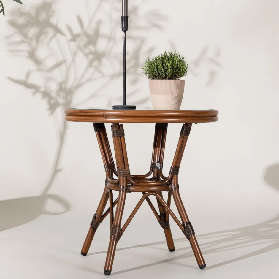 De Rivky salontafel is de ultieme mix van stijl en functie. Met zijn bruine aluminium frame en een elegant glazen tafelblad wordt deze tafel al snel een centraal onderdeel van je terras of tuin.