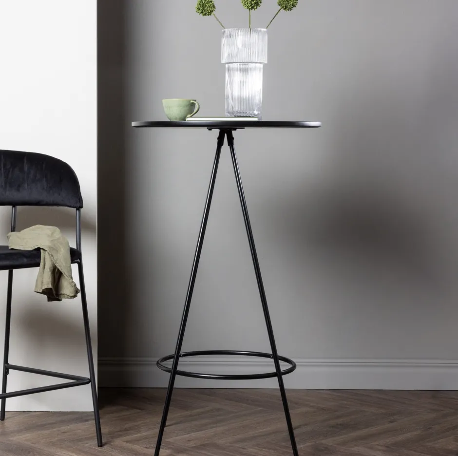 De bartafel Wykisha heeft een minimalistisch, Scandinavisch ontwerp dat zeer aantrekkelijk is voor het oog! Het ronde tafelblad is van zwart MDF met fineer en de luchtige, kegelvormige tafelpoten zijn eenvoudig uit te klappen in zwart metaal met een voetsteunframe voor extra comfort. Wykisha is perfect voor de paarse keuken of als je gewoon je interieur naar nieuwe hoogten wilt brengen! De diameter van de tafel: 60cm.