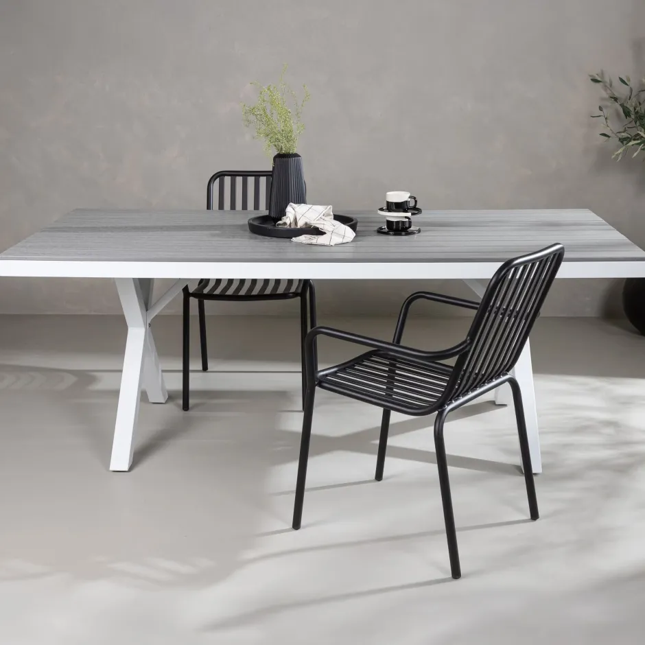 Eettafel uit de Ceddrick serie in een klassiek ontwerp met een rechthoekig tafelblad in decoratief aintwood – net zo duurzaam als stijlvol! Het frame is van wit aluminium, wat licht van gewicht is en de tafel makkelijk te verplaatsen maakt. De tafel is perfect geschikt voor buitengebruik en past daarom net zo goed in de serre als in de tuin. Combineer met onze eetkamerstoelen uit dezelfde serie voor een complete look en creëer een opvallende blikvanger op je terras. Hier kun je deze zomer je dierbaren verzamelen voor heerlijke maaltijden!