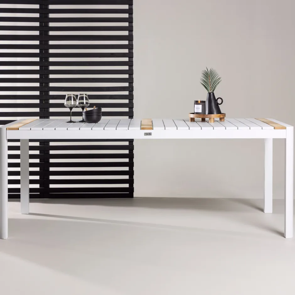 Richt het terras of de patio in met een klassieke stijl die nooit uit de tijd gaat! Eettafel Lynnetta heeft een teakhouten tafelblad en een wit aluminium onderstel. Het ontwerp heeft invloeden uit Scandinavië met rechte, luchtige vormen. Hier krijg je een neutrale en charmante eettafel die in de meeste omgevingen past. Kleed je eetgroep aan of juist af door je type eetkamerstoelen te kiezen en een persoonlijke touch aan het interieur te geven!