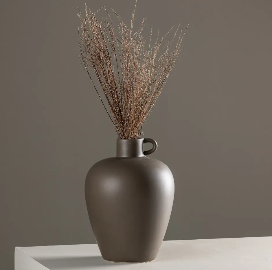 Een klein handvat aan één kant voegt een extra dimensie toe en zorgt voor een balans tussen functionaliteit en esthetiek. Dit kleine handvat wordt een subtiel aandachtspunt dat een stijlvol accent geeft aan het algehele uiterlijk van de vaas.