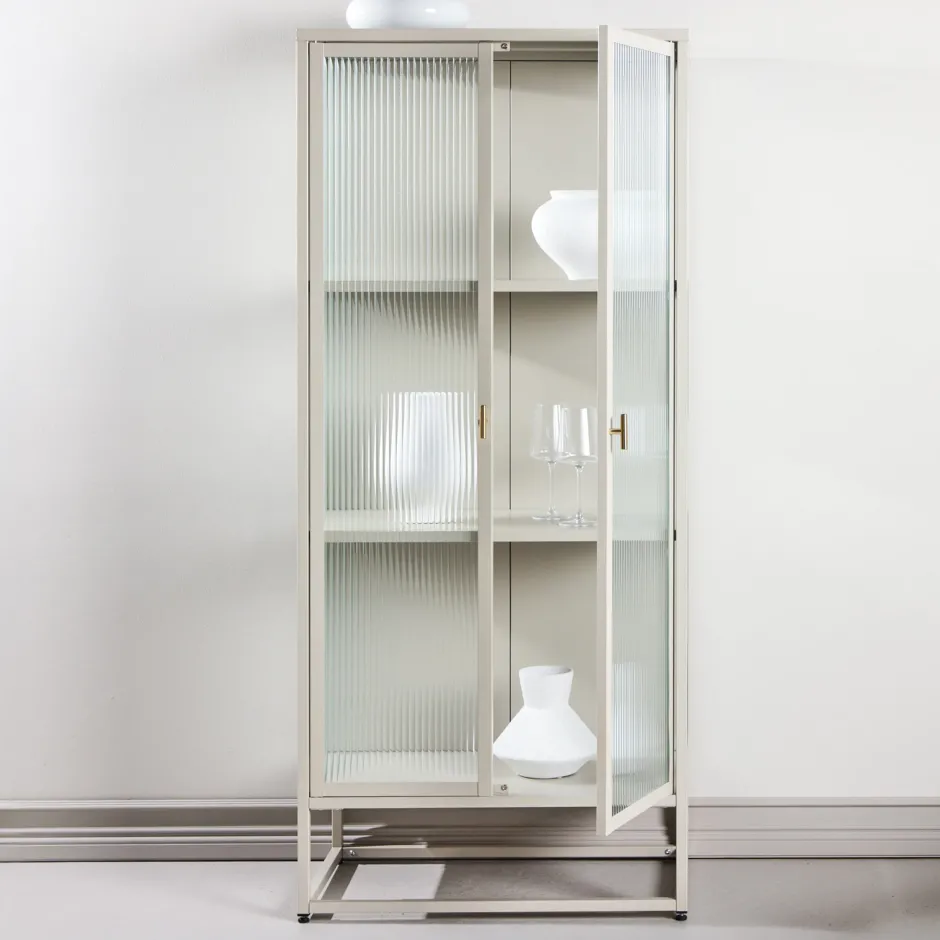 Alieke is een smaakvolle kast die functie en design in perfecte harmonie combineert. Hij heeft twee hoge glazen deuren met een geribbelde textuur, die zorgen voor een geraffineerde look en een prachtig spel van licht en schaduw.