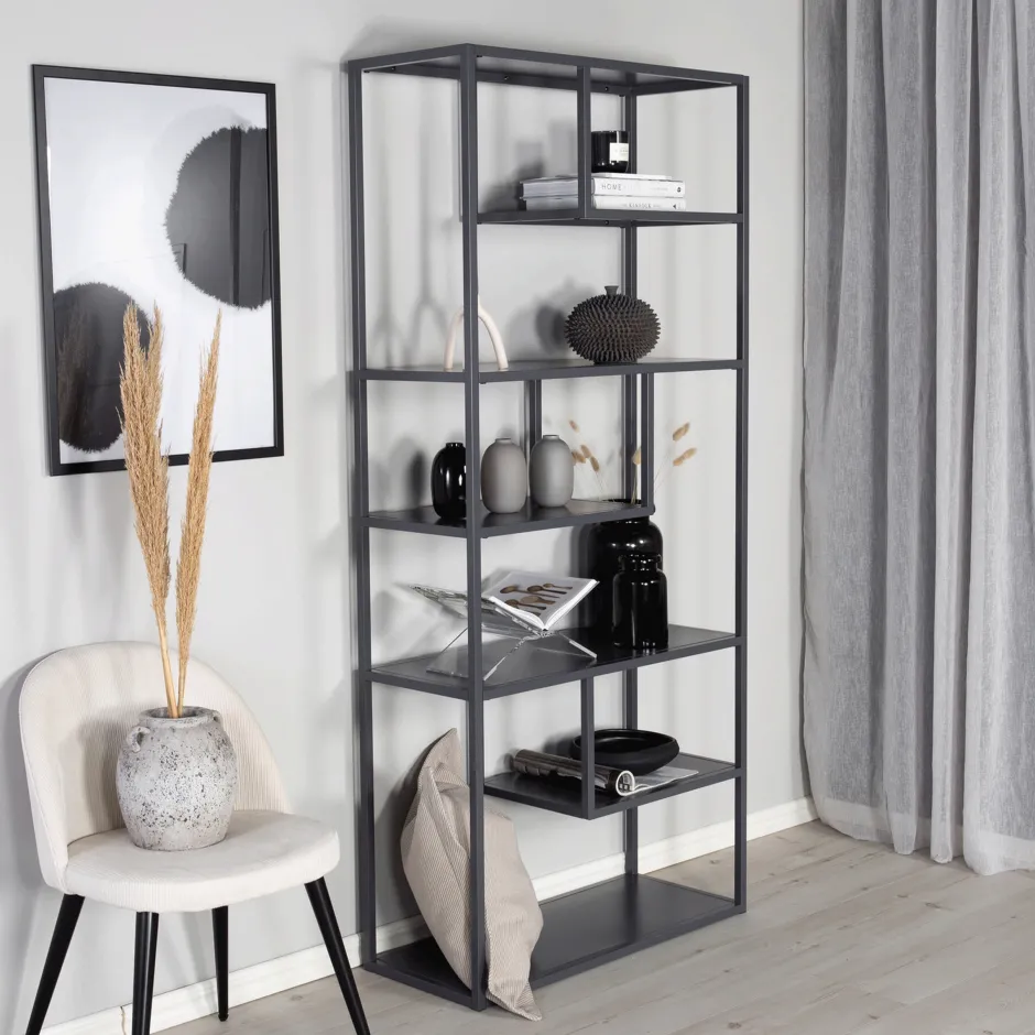 Keonte, in modern industrieel ontwerp gemaakt van lichtgrijs gepoedercoat staal met verschillende reliëfvlakken op verschillende hoogtes. Afmetingen: Lengte: 85 cm, breedte: 35 cm, hoogte: 188 cm. Lichtere montage vereist.