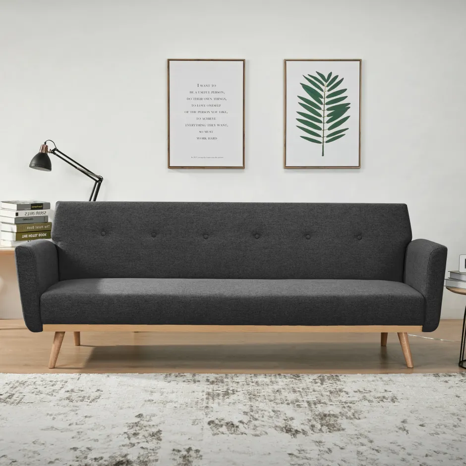 De 3-zits slaapbank wordt gepresenteerd in een stijlvolle, fijne structuurstof in zwart en stevige massief houten poten. Door de vouwfunctie van de rugleuning kan de bank snel worden omgebouwd tot slaapbank. Het massief houten frame zorgt niet alleen voor een stevige stand, maar biedt ook een geweldig contrast met de stoffen bekleding. De bekleding gaat helemaal rond en de rug is echt. De bekleding en de zit- en ligfunctie zorgen voor een aangenaam zit- of ligcomfort van een klasse apart. Het knoopstiksel op de rugleuning is een bijzonder hoogtepunt. Dit designjuweeltje wordt niet alleen een visueel hoogtepunt in je huis, maar ook je nieuwe plek van welzijn.
