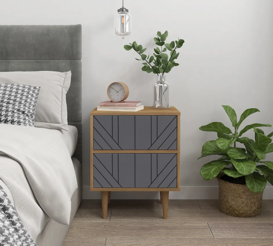 Dit nachtkastje overtuigt met neutraal grijs op het front en een geometrisch zwart lijnenpatroon. In twee greeploze laden is genoeg bergruimte voor allerlei spulletjes.