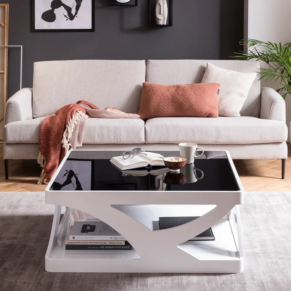 De vierkante salontafel combineert modern design met een portie extravagantie. De hele tafel is gemaakt van MDF en gelakt in hoogglans wit. Het glazen blad van 10 mm is zwart en gemaakt van veiligheidsglas. Het designjuweel valt meteen op door zijn unieke vormgeving, maar bij de productie is ook rekening gehouden met praktische doeleinden. Het biedt voldoende opbergruimte voor tijdschriften, afstandsbedieningen, mobiele telefoons enz.