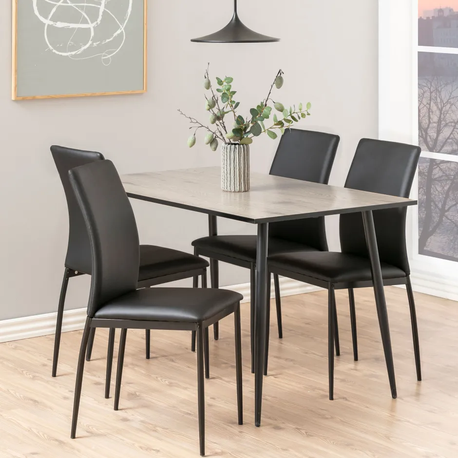 Gemaakt van metaal en melamine is deze eettafel zowel visueel aantrekkelijk als duurzaam. Het heeft slanke, schuine poten en een tijdloos ontwerp. De keuze van materialen zorgt voor minimaal onderhoud van het meubilair dat gemakkelijk schoon te vegen is.