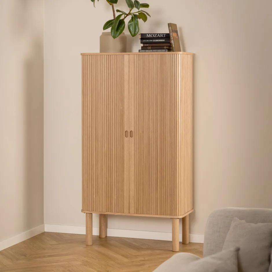 De Alandria opbergkast van Bendt is een verfijnd voorbeeld van Deens design, waar vorm en materiaal naadloos samenkomen. De kastdeuren zijn gemaakt van gelakt eikenfineer en een bijpassend gelakt eikenhouten onderstel, wat zorgt voor een harmonieuze uitstraling.