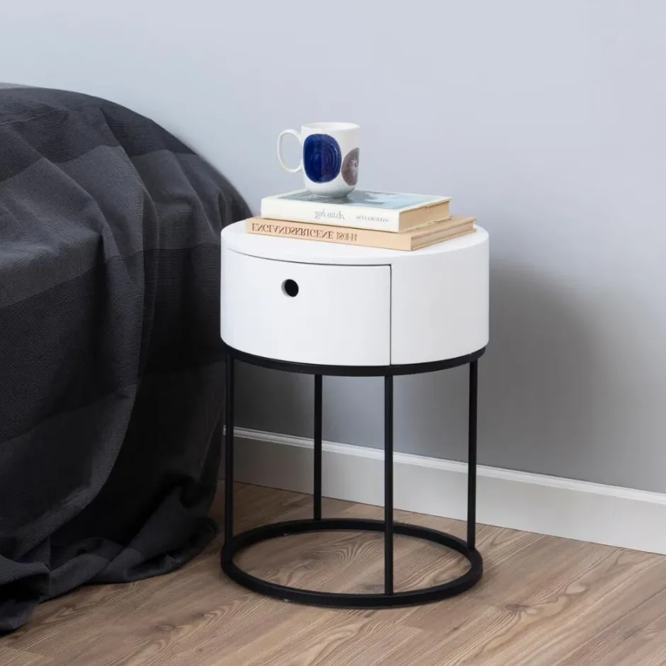 Een ingetogen nachtkastje met veel stijl en opbergruimte. De ronde vorm en minimalistische stijl maken dit tafeltje perfect voor elke slaapkamer. Het neemt niet te veel ruimte in de kamer in en is voorzien van een lade voor die spullen die je liever verborgen houdt. Het zwarte blad wordt ondersteund door een gepoedercoat metalen onderstel om de look compleet te maken.