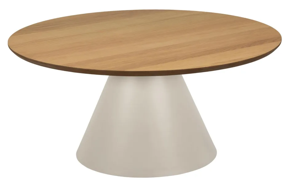 Deze ronde salontafel creëert een visuele intrige en verheft de zithoek met zijn subtiele uitdrukking. Het ontwerp combineert industriële en natuurlijke elementen die een gevoel van evenwicht en harmonie oproepen. De conische zuilvoet van grijs staal oogt zachter in combinatie met een rond blad van gelakt eikenfineer.
