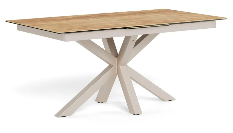 Omdat functionaliteit en design vaak even belangrijk zijn bij eettafels, is deze tafel, die je kunt verlengen, niet alleen gemaakt om zijn doel te dienen, maar ook om je oog te strelen. Daarom is het tafelblad gemaakt van keramiek met een wilde eikenhouten look. Het is niet alleen cool en supermodern, maar ook hitte- en krasbestendig en vraagt weinig onderhoud. Het sculpturale kruisvormige onderstel draagt ook bij aan een uitstraling die echt een statement maakt.