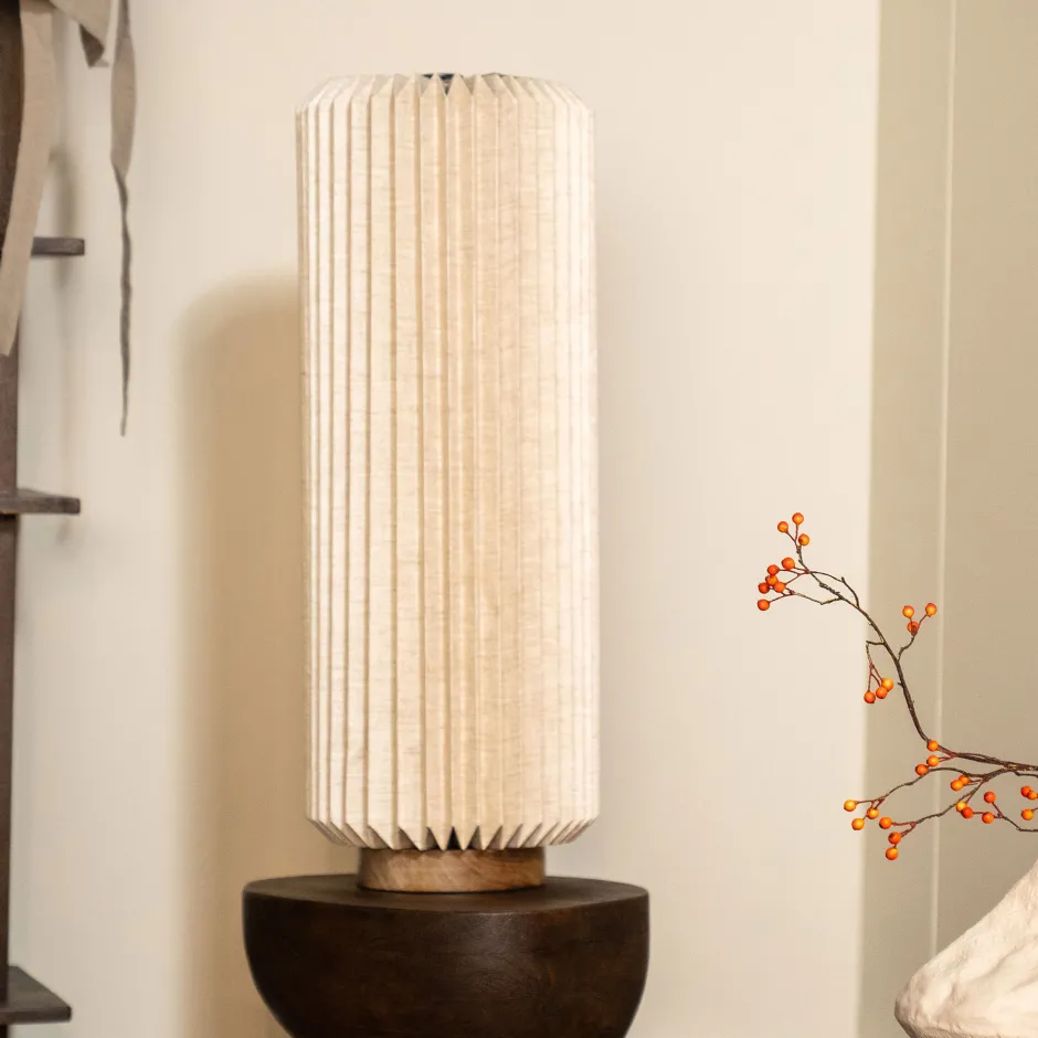 Ben je op zoek naar een eyecatcher in je interieur én wat meer licht? Sla dan twee vliegen in één klap met deze stijlvolle lamp uit de collectie van By-Boo. ‘Zuki’ is gemaakt van papier met een linnen afwerking en rust op een houten poot. Het licht komt mooi door de linnen stof en verlicht de ruimte op een prachtige manier.
