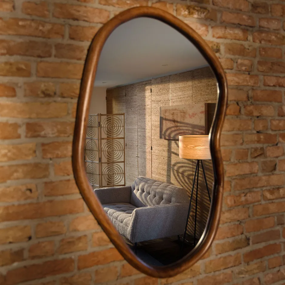 Spiegel ‘Ashley’ van Dutchbone is een expressieve organisch gevormde spiegel met een opvallende, dikke rand van mangohout, geïnspireerd op design uit de seventies. Het warme hout en de vloeiende lijnen geven Ashley een karaktervolle uitstraling die perfect aansluit bij een retro interieur. De rijke houtnerf en natuurlijke kleurvariaties maken elke spiegel uniek, terwijl de speelse vorm zorgt voor een levendig en stijlvol accent aan de wand.