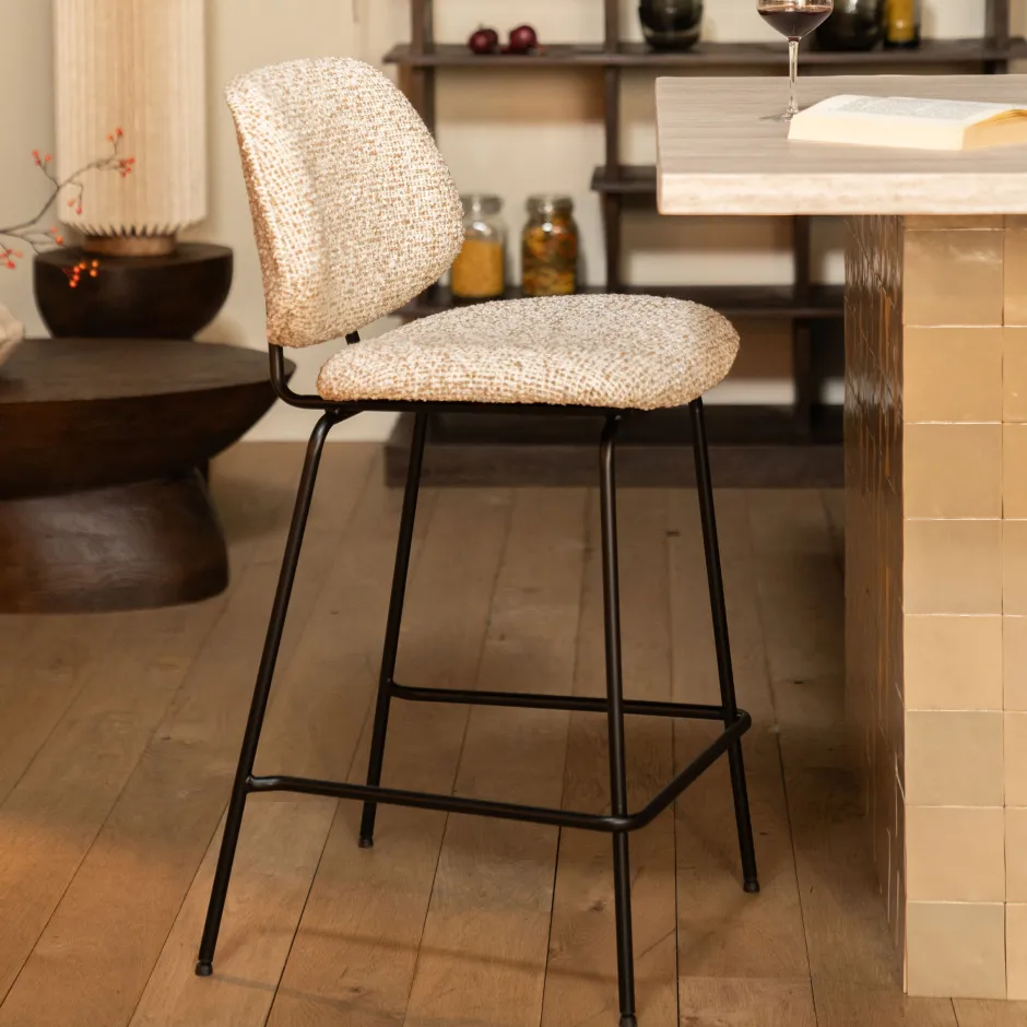 Barstoel ‘Jon’ van Eleonora is een perfect voorbeeld van een trendy item dat prachtig staat in je interieur. De grove textuur van de stoffen bekleding geeft de stoel een mooie uitstraling. De zachte stof zorgt voor een heerlijk zitcomfort en de zitting rust op slanke metalen poten.