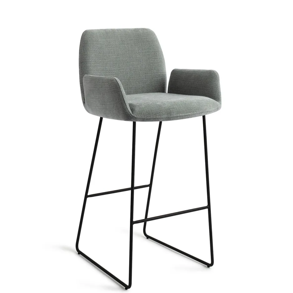 De armleuningen van de Misaki barkruk zijn een beetje los van de rugleuning. Deze eigenschap geeft de stoel bijna het uiterlijk van uitgestrekte vleugels, wat de stoel een licht karakter geeft. Bovendien bieden de armleuningen ondersteuning en comfort. De bekleding is een duurzame 100% polyester stof die er uitziet en voelt extreem zacht en luxe.
