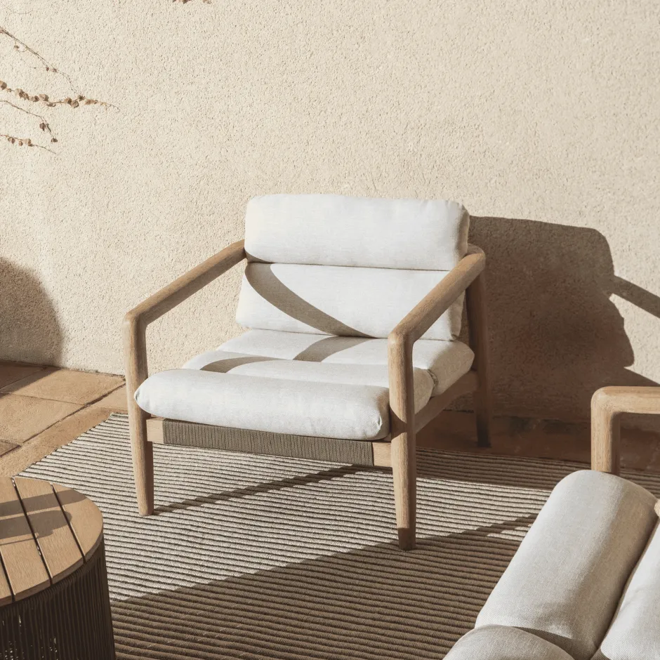 De Menfi fauteuil is gemaakt van massief acaciahout en handgevlochten touw. Het ontwerp wordt gedefinieerd door zachte lijnen en evenwichtige proporties, die de waarde van hout en de toewijding van vakmanschap benadrukken. Acacia is zeer goed bestand tegen vocht en micro-organismen, waardoor het een duurzaam meubel voor buiten is. Het touw, behandeld om UV-stralen te weerstaan, biedt flexibiliteit en comfort en maakt het ontwerp af met een subtiele textuur. Gemaakt van FSC™ 100%-gecertificeerd hout, geschikt voor binnen en buiten. Breng ten minste eenmaal per jaar Sterina houtbeschermer aan om het uiterlijk te behouden. De kussens hebben afneembare hoezen, zijn eenvoudig te onderhouden en we raden aan ze op te bergen op regenachtige dagen.