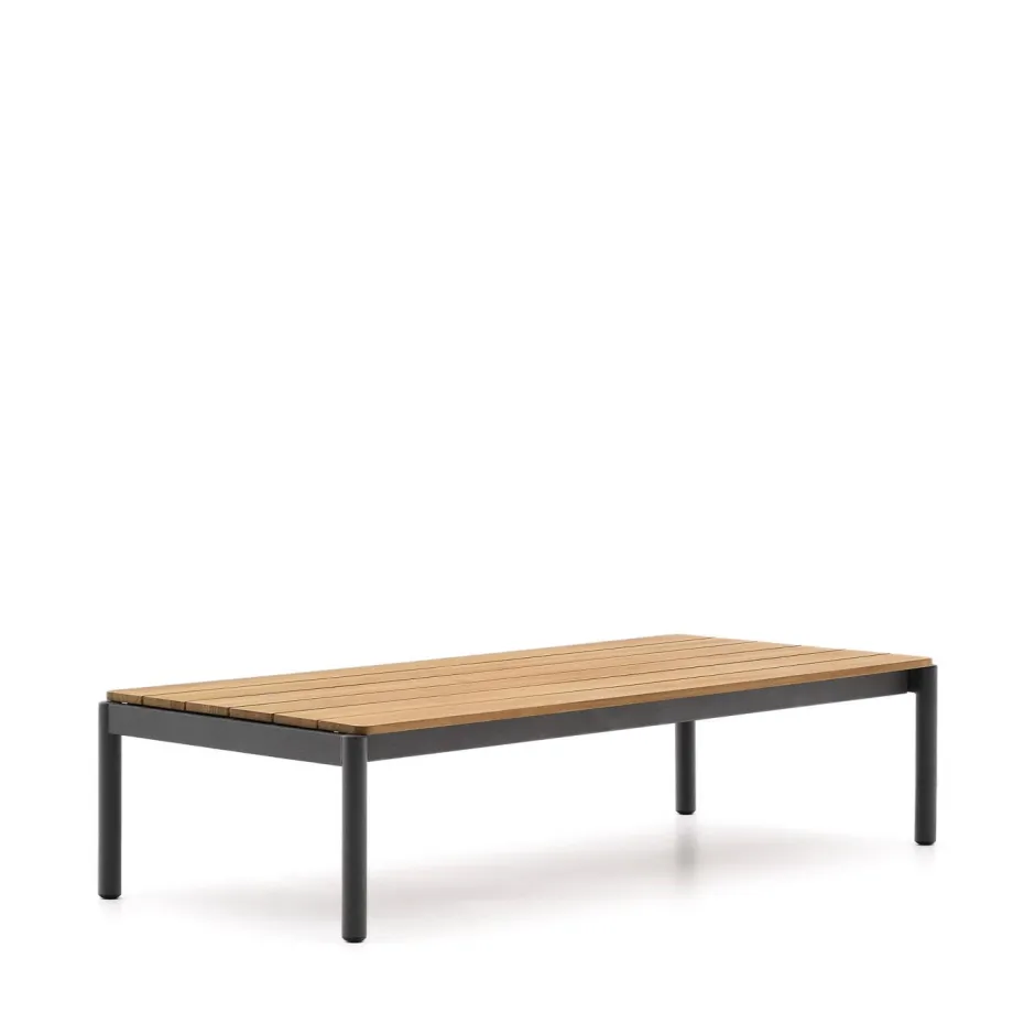 Aquí tienes el texto revisado para sonar más natural en neerlandés: De salontafel van aluminium met een teakhouten blad is een meubelstuk dat functionaliteit, design en duurzaamheid combineert om elke buitenruimte te verfraaien. Exclusief ontworpen voor Kave Home door Made Studio, heeft de tafel een lichtgewicht aluminium frame dat tegelijkertijd zeer sterk is. Dit maakt het ideaal voor langdurig gebruik buiten, aangezien het bestand is tegen oxidatie, corrosie en de schadelijke effecten van UV-stralen. Het teakhouten blad voegt een extra dosis verfijning en warmte toe, en staat bekend om zijn uitzonderlijke weerstand en duurzaamheid in buitenomgevingen. Dit edele materiaal is perfect bestand tegen vocht, waardoor het zelfs onder de meest veeleisende omstandigheden zijn kracht behoudt. Met een ontwerp dat gericht is op veelzijdigheid, kan deze tafel perfect worden gecombineerd met andere tafels uit dezelfde collectie. Zo kun je sets van verschillende hoogtes creëren die passen bij jouw stijl en wensen. Het elegante afwerkingsniveau geeft een frisse, moderne uitstraling en past moeiteloos in elke buitenomgeving. Het is het ideale meubel voor wie op zoek is naar tijdloos design, zonder concessies te doen aan kwaliteit of functionaliteit. Met Sorells stel je jouw ideale bank samen, door de modulaire elementen af te stemmen op jouw persoonlijke behoeften en levensstijl. Het is de perfecte combinatie van modern design, hoogwaardige materialen en comfort, die jouw buitenmomenten opnieuw definieert.