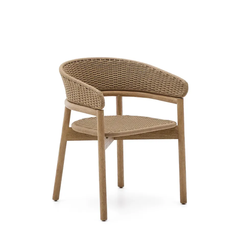 De Arinella collectie vertegenwoordigt de combinatie van rustiek en modern. Elk meubelstuk combineert de verhevenheid van massief acaciahout met een geborstelde afwerking, die de natuurlijke tinten en unieke nerf benadrukt, waardoor elk meubelstuk uniek is. De zitting en rugleuning, gemaakt van UV-bestendig handgeweven touw, zorgen voor een duurzame eigentijdse look die geschikt is voor alle soorten omgevingen. Dit ontwerp, geschikt voor zowel binnen- als buitengebruik, heeft een gegalvaniseerde ijzeren structuur met poedercoating, wat de stevigheid garandeert. Daarnaast heeft het hout een PU-afwerking op waterbasis om de duurzaamheid te versterken. Arinella is gemaakt van 100% FSC™-gecertificeerd hout en weerspiegelt niet alleen een moderne esthetiek, maar ook een toewijding aan verantwoord bosbeheer.