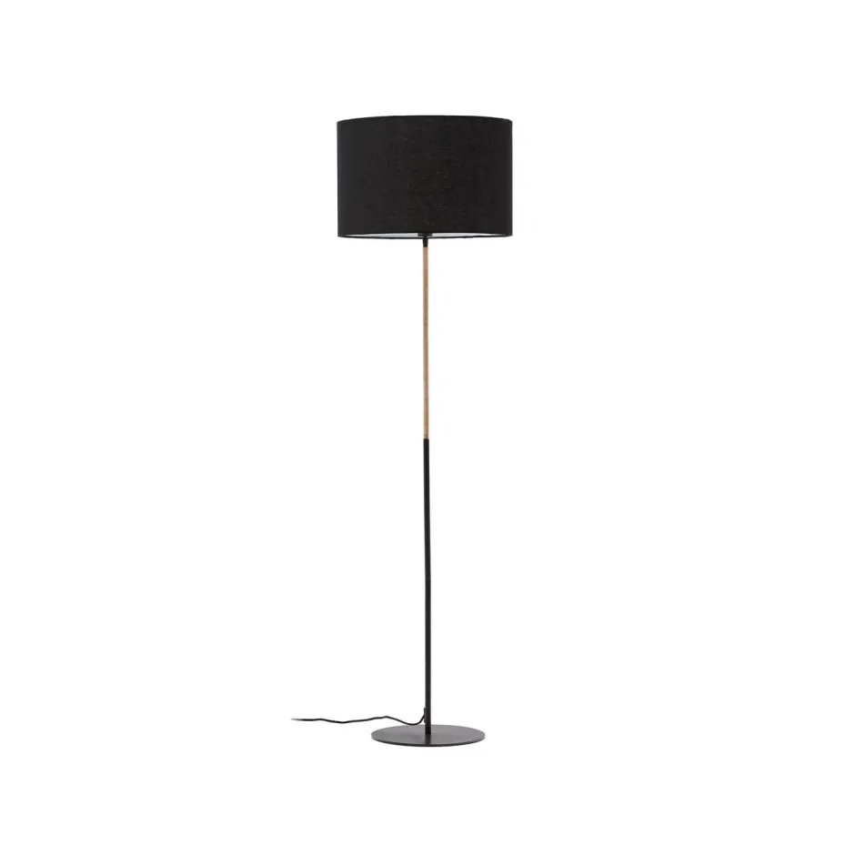 - Metalen staande lamp met detail van natuurlijk rotan en zwarte katoenen kap.