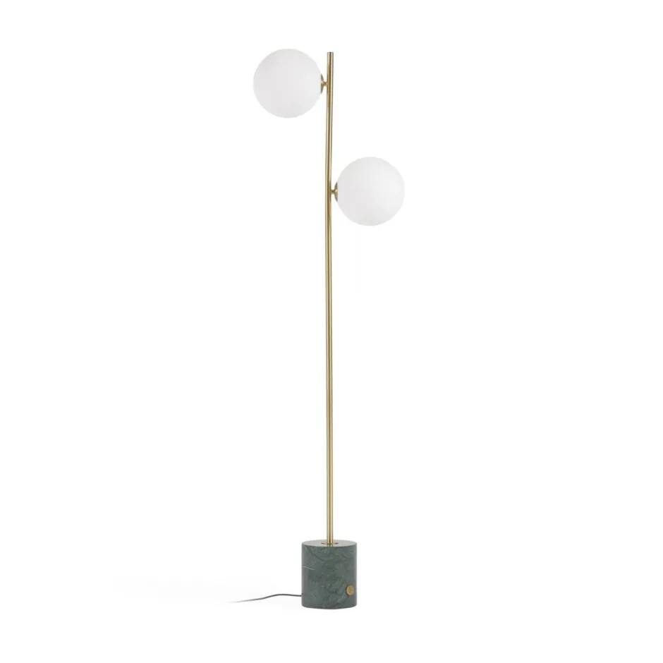 De lampencollectie Phant valt op door zijn bolvormige kappen van matglas die zijn bevestigd aan een marmeren voet met een groene afwerking. Een ontwerp dat op zichzelf schittert.