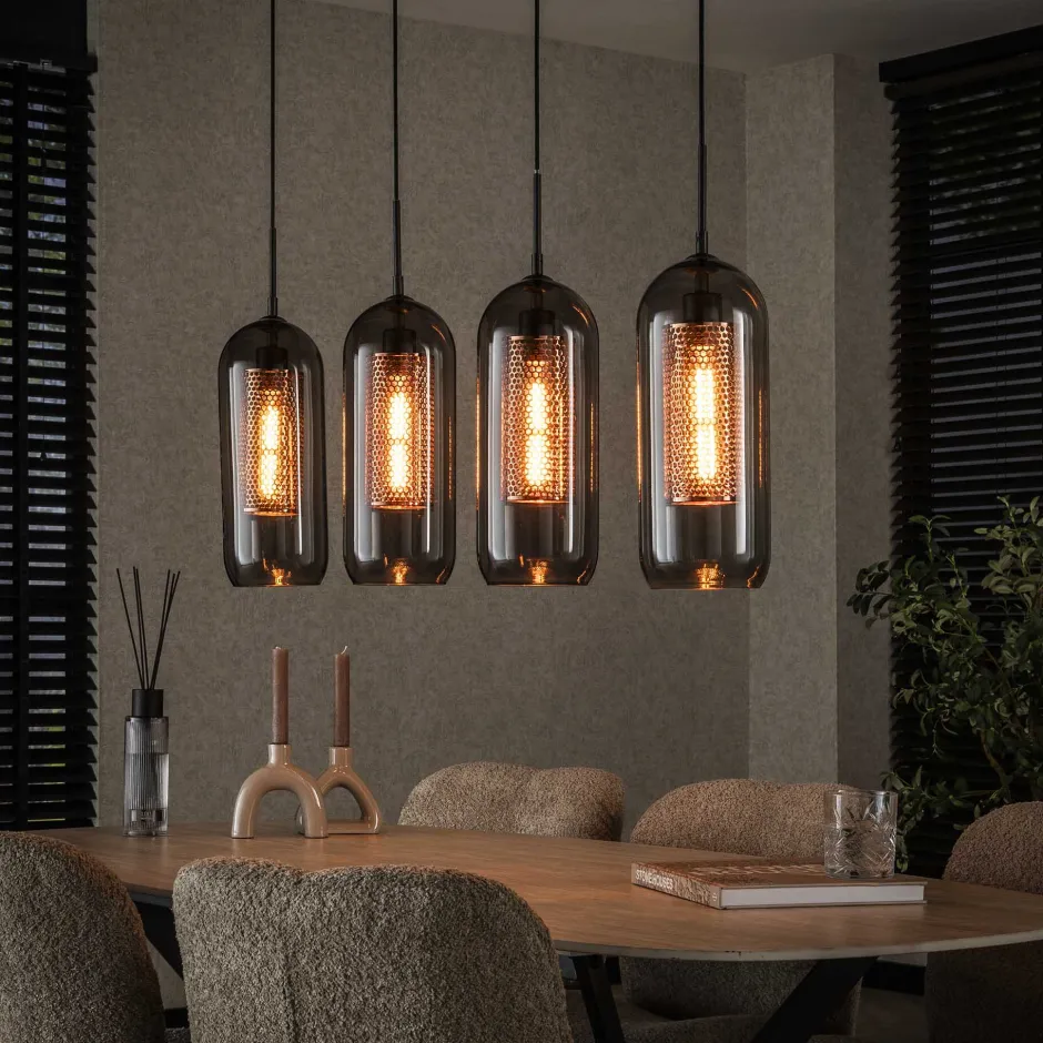 Deze hanglamp heeft vier mondgeblazen smoke glas kappen. Binnen deze kappen zitten vier cilindervormige koper mesh kappen verwerkt. Deze combinatie zorgt voor een trendy en chique uitstraling. Daarnaast wordt hierdoor het licht mooi gedoseerd door de ruimte verdeeld. De lamp is tot 150 cm in hoogte verstelbaar. Er wordt aanbevolen om LED lichtbron (8473) te gebruiken.