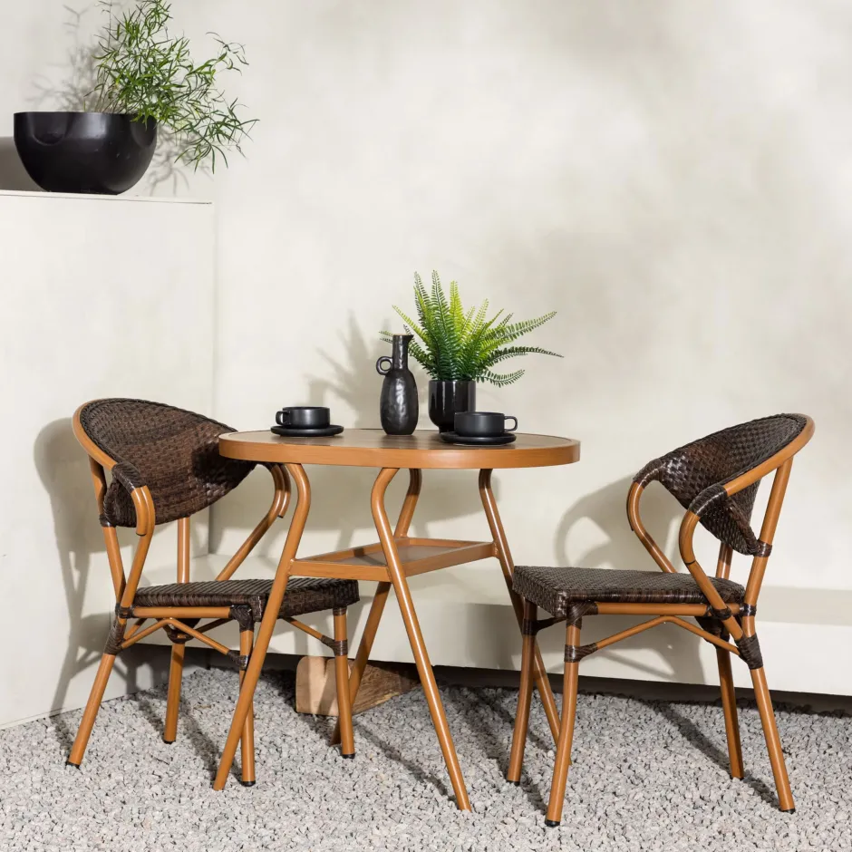 Verander je buitenomgeving in een uitnodigende en comfortabele ruimte met onze elegante Alesia set, bestaande uit twee stoelen en een tafel. Deze set in een warme bruine tint heeft een veelzijdig ontwerp dat past in verschillende interieurstijlen. De Alesia groep is gemakkelijk te verplaatsen en te onderhouden, waardoor het een praktische en handige oplossing is voor ontspanning buitenshuis.