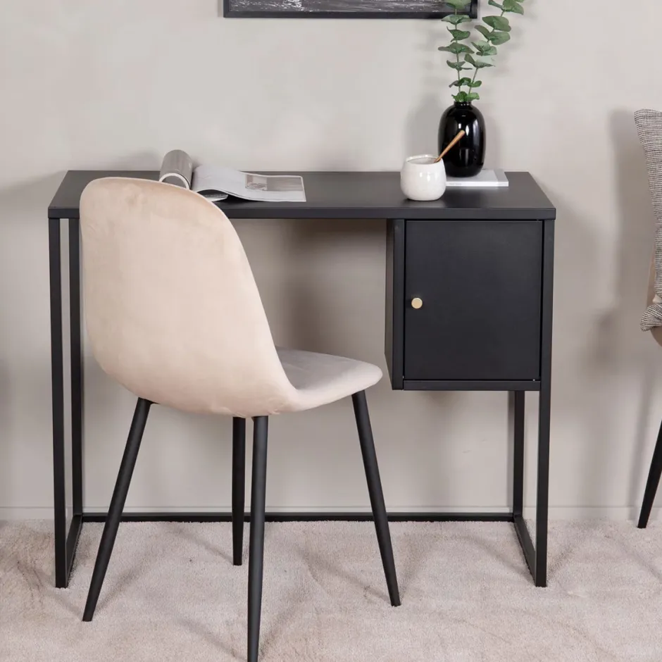 Baktal, een mooi bureau in modern industrieel ontwerp, geïntegreerd frame en een vierkante kleinere kast. Een kleinere deur met verborgen opbergruimte en een reliëfoppervlak in de rechterhoek van zwart gepoedercoat staal. De deur heeft een messingkleurige knop. Afmetingen: Lengte: 95 cm, breedte: 45 cm, hoogte: 50 cm. Lichtere montage vereist.
