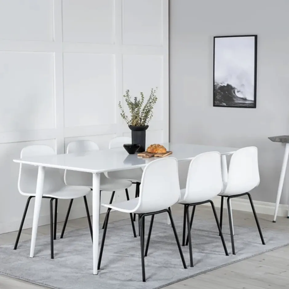 Klassieke rechthoekige eettafel uit de serie Austina in stijlvolle witte kleur. Het tafelblad van MDF en de metalen tafelpoten geven je een duurzame eettafel in eenvoudige vormen. Het ontwerp heeft invloeden uit Scandinavië en staat zijn mannetje. De mooie gelijmde poten geven een moderne indruk. Richt de woonkamer licht en fris in met een eenvoudige, luchtige eettafel waar de familie kan samenkomen voor gezellige maaltijden!