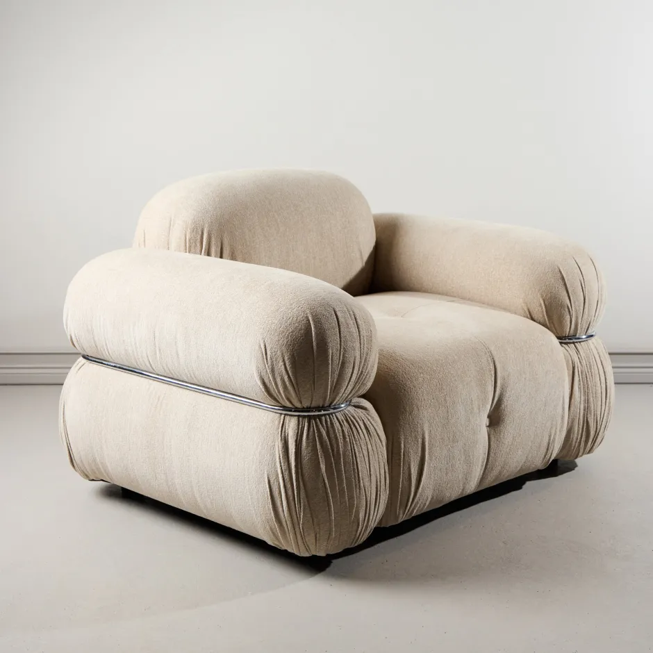 De zachtbeige bekleding biedt een warme en tijdloze look, terwijl de zilverkleurige details een moderne twist geven. Jett is niet alleen comfortabel om in te zitten – het verheft de hele kamer met zijn zelfverzekerde aanwezigheid.