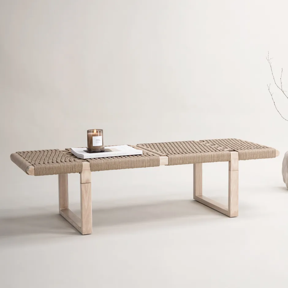 Kyson, een moderne en stijlvolle bank die gegarandeerd een hit is in huis! Het onderstel heeft rechte Scandinavische vormen van staal en de zitting van duurzaam beige touw. De heerlijke combinatie van materialen en aardse kleuren geeft een mooie totaalindruk aan het smaakvolle ontwerp, en het praktische formaat van de bank maakt een breed gebruik mogelijk. Plaats hem solitair als een leuk detail voor de hal of samen met de bankgroep om meer zitplaatsen te creëren als er geliefden op bezoek komen!