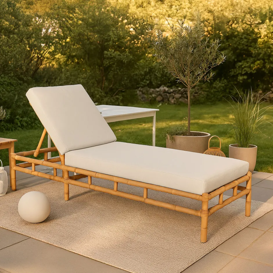 Richt het terras in met een modern ligbed in luxe uitstraling uit de Zev serie! Deze comfortabele ligstoel creëert een uitnodigende en tropische sfeer met zijn doordachte totaalontwerp. De bijbehorende grijze kussens zijn gemaakt van zachte polyester stof. De romp is gemaakt van natuurlijk gekleurd bamboe en het natuurlijke materiaal geeft elk afzonderlijk meubel een uniek karakter. Een stijlvol en slim ligbed dat gewoon de aandacht trekt en het gemak verhoogt op een zonnige zomerdag.