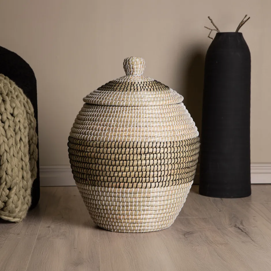 Lashann is onze ronde opbergmand met deksel! Deze mand kan voor veel gebruikt worden; handdoeken in de badkamer, minder opbergruimte in de woonkamer of waarom zou je hem niet vullen met speelgoed in de kinderkamer? Hij is net zo decoratief als interieurdecoratie, hij is functioneel en past in verschillende kamers. De mand is naturelkleurig en groen met witte details. Versier je huis slim en netjes!