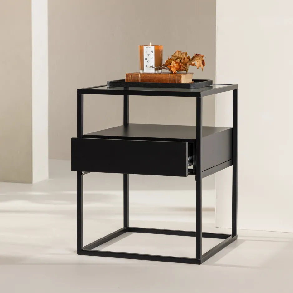 Deze zwarte bijzettafel heeft een glazen blad en een frame van zwart staal. Met ruimte voor handige opslag, is deze bijzettafel ook uitgerust met een discrete lade en planken, waardoor zowel verborgen als zichtbare opslag mogelijk is. Nooit meer rommel – houd je spullen georganiseerd en versier met een mooie kaarsenhouder of favoriete boek voor een persoonlijk en gezellig tintje.