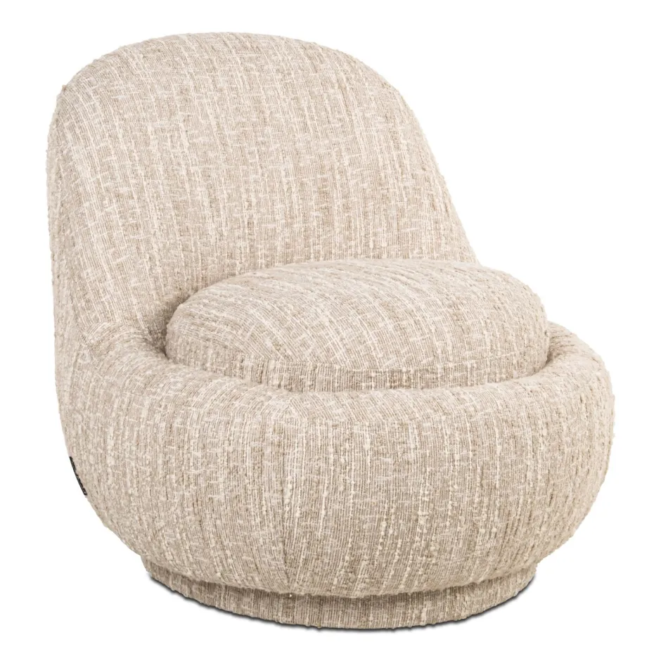Fauteuil Arlanda heeft een afgeronde rugleuning en een royaal kussen, bekleed met beige angora. Een zachte en stijlvolle stoel, zonder draaifunctie.