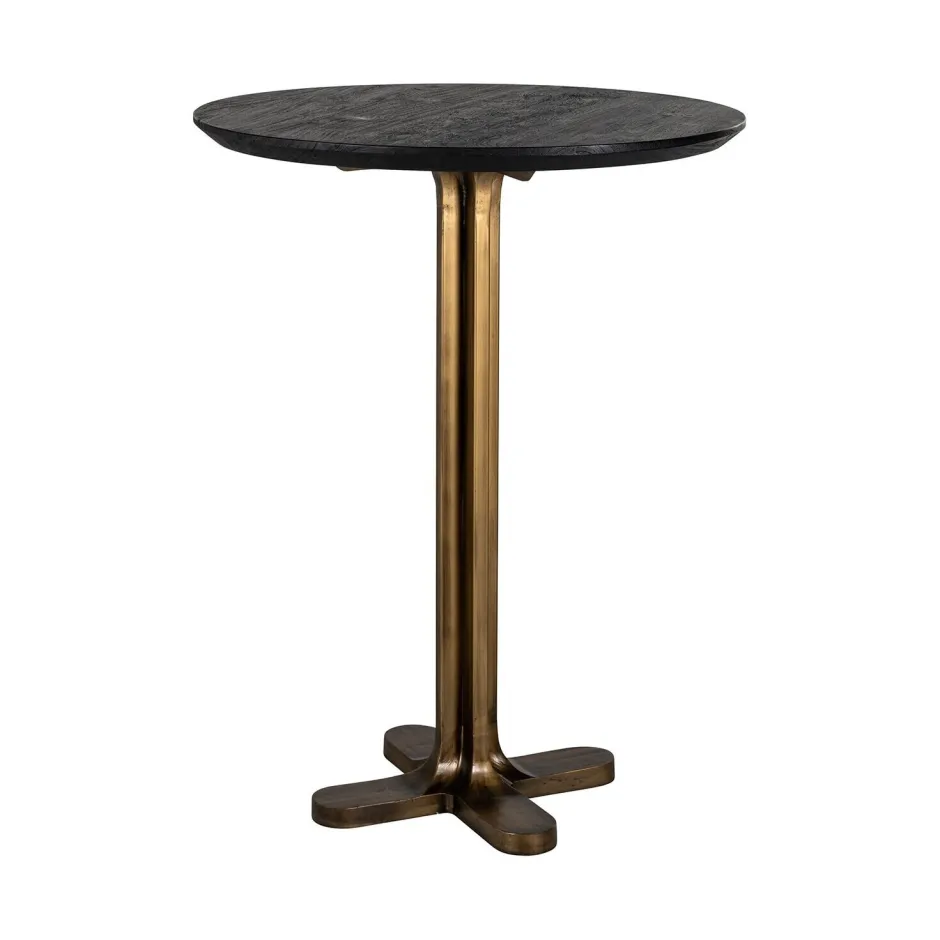 Deze ronde versie van de bartafel Revelin combineert een donkerbruin blad met geborsteld gouden poten. Een verfijnd stuk…