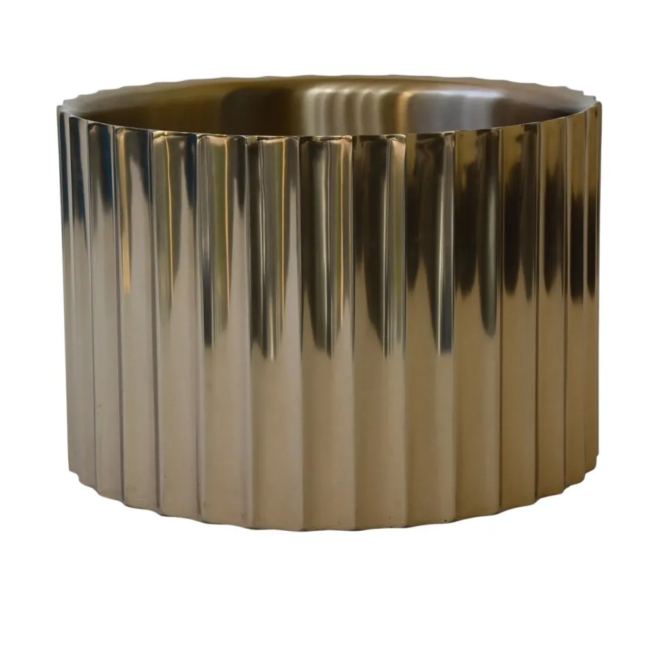 Deze champagnekoeler heeft een ronde en gesloten vorm met een stabiel silhouet. De afwerking toont een zachte goudtint met een lichte glans, wat zorgt voor een rustige en verfijnde uitstraling. Door het evenwichtige ontwerp is de koeler geschikt voor gebruik op een tafel of bar en functioneert hij als zowel praktisch als decoratief element.