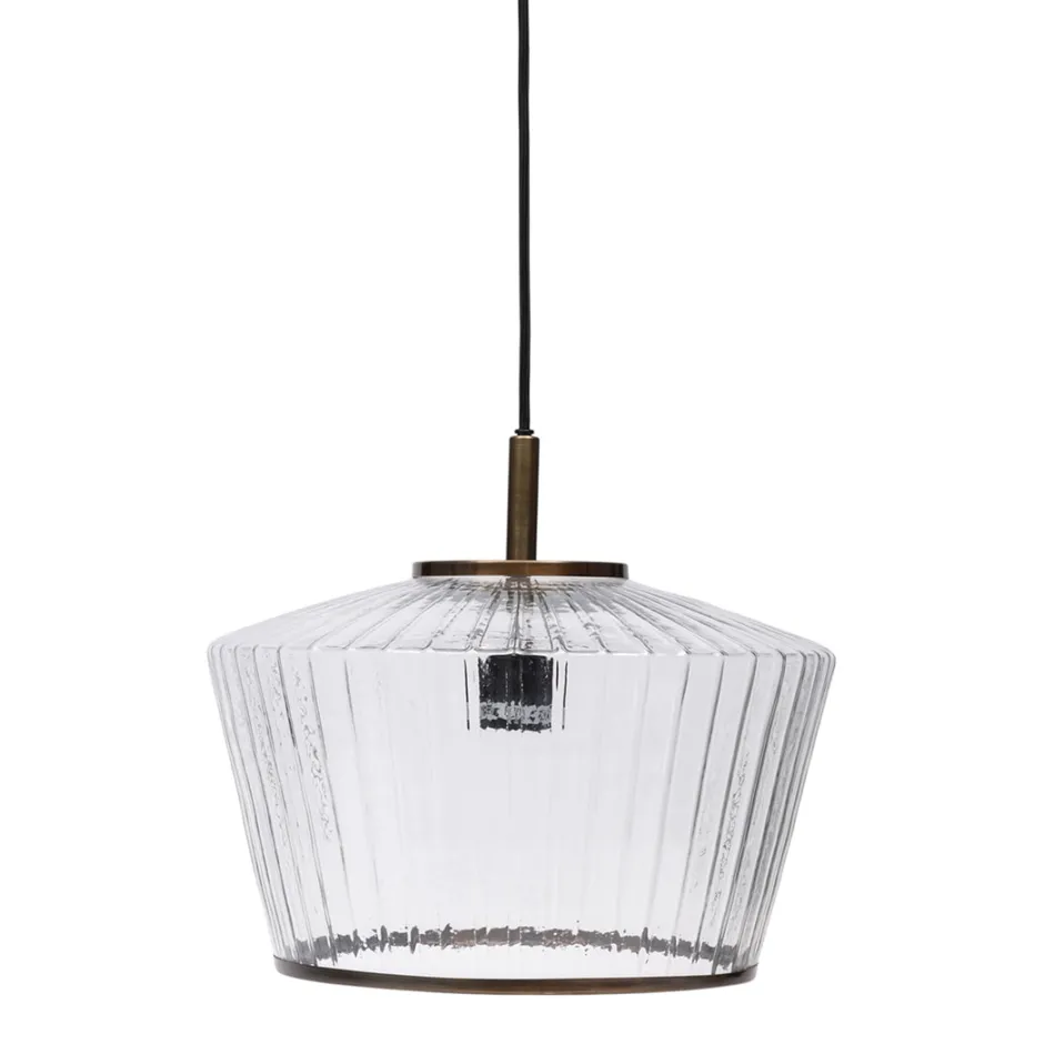 De Nolana Glass Hanging Lamp is een stijlvolle hanglamp gemaakt van glas. De glazen kap heeft een geribbelde afwerking. Dit geeft een mooi effect aan het licht. Boven op de lamp zit een metalen plaatje waaraan het strijkijzersnoer, een snoer van textiel, is bevestigd.