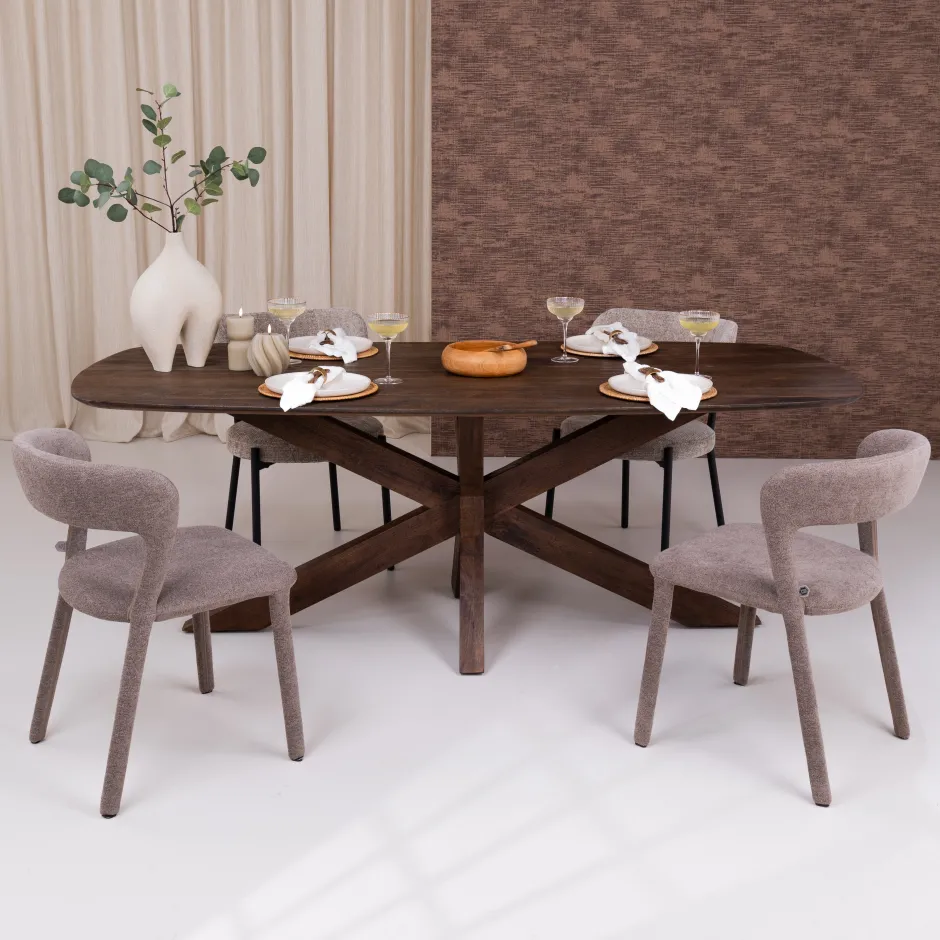 De Lissabon eettafel is een stijlvolle en robuuste tafel die warmte en elegantie uitstraalt. Volledig vervaardigd uit massief mangohout, toont ze prachtige natuurlijke nerven en kleurnuances die elke tafel uniek maken. Het royale, ovaalvormige blad rust op een karakteristieke houten kruispoot, die zorgt voor een stevige basis en een eigentijdse uitstraling.