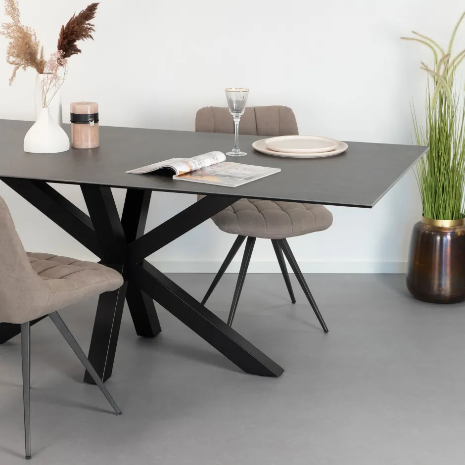 Een fijne eettafel maakt jouw eethoek helemaal af. Zo ook eettafel ‘Parker’ uit de Sohome collectie. Deze tafel heeft een zwart blad en onderstel in dezelfde kleur wat het een stoere uitstraling geeft. Het glazen blad is afgewerkt met een keramieken bovenlaag. Deze bovenlaag heeft een prachtige structuur en matcht erg fijn met het gepoedercoat metalen onderstel in kruisvorm. Een kruispoot is naast de opvallende looks ook erg handig. Het onderstel zit namelijk niet in de weg als je aan de uiteindes van de tafel zit. Zo kunnen er aan alle kanten van eettafel ‘Parker’ mensen plaats nemen en maak je dus optimaal gebruik van de ruimte. Aan het formaat van 160 centimeter passen 6 eetkamerstoelen en aan de variant van 200 centimeter nemen met gemak 8 personen plaats.
