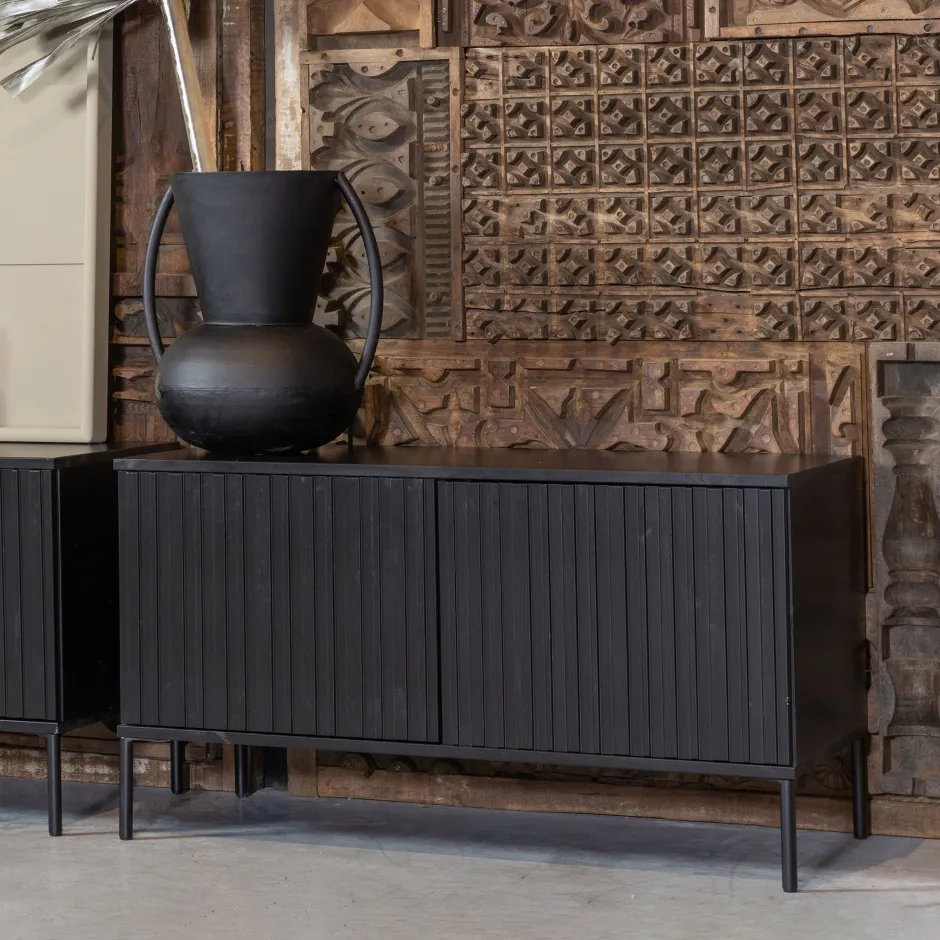 Onze succesvolle Gravure serie in een nieuw jasje! Dit Gravure New tv-meubel, uit de collectie van het Nederlandse interieurmerk WOOOD, is verkrijgbaar in twee formaten: 100 cm breed en 150 cm breed. Gravure New tv-meubel is uitgevoerd in grenenhout en afgewerkt met een diepzwarte beits. Het interieur is vervaardigd uit zwart spaanplaat. De poten zijn van metaal met een zwarte coating. Het Gravure New tv-meubel beschikt over twee deuren met een geluidloos push-to-open systeem.